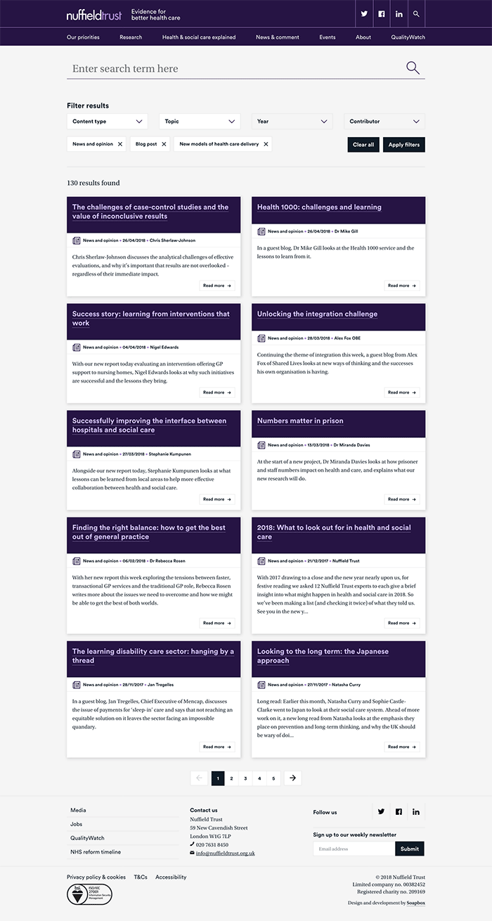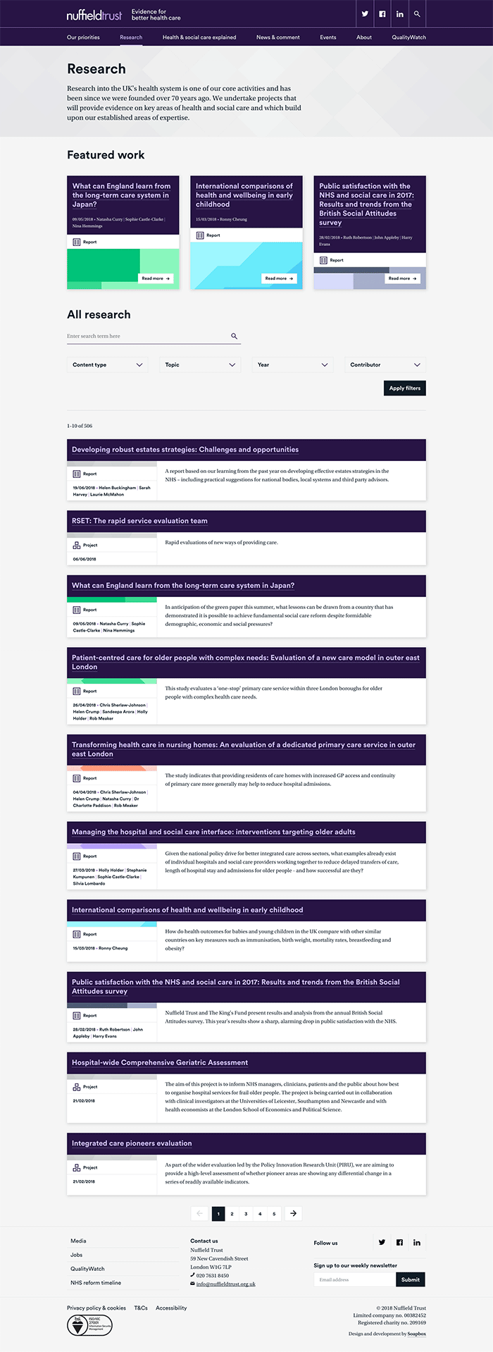 We designed an in-page filtering system which is used on landing pages such as 'Research', where content exceeds a recommended number, to enable users to find desired content easier.