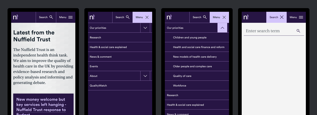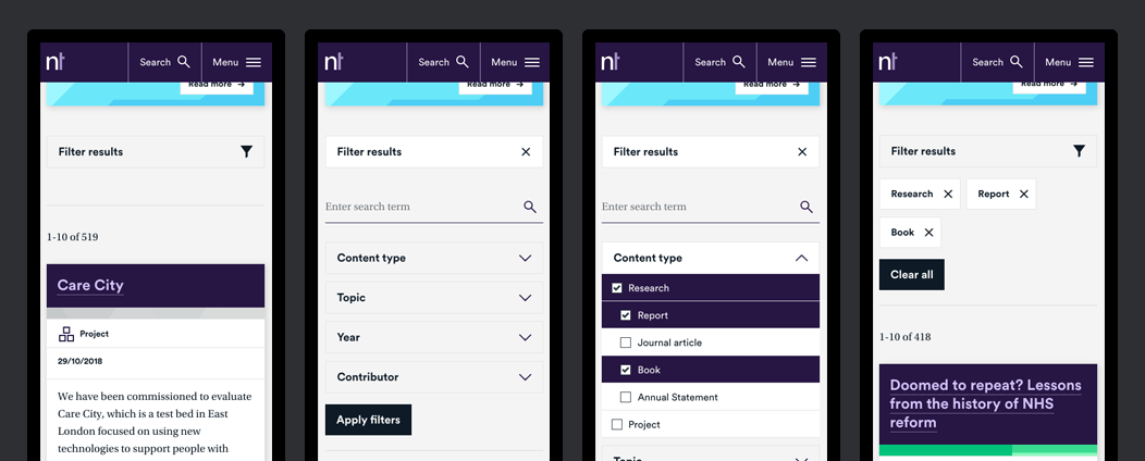 We designed an in-page filtering system which is used on landing pages such as 'Research', where content exceeds a recommended number, to enable users to find desired content easier.