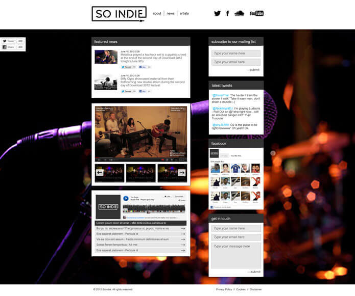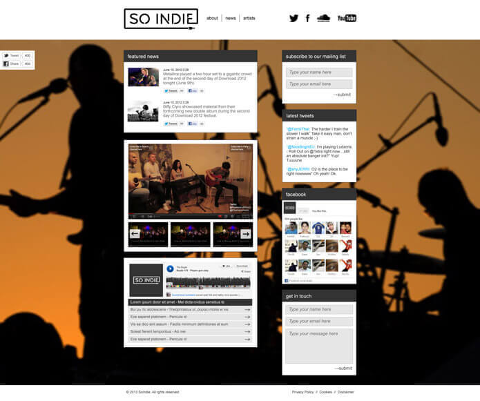 The website is an aggregator of social media and artist news and information. On refresh, a different image background is loaded, selected by a predefined pool of images. This approach enables periodic visual refreshes while minimising the need for a visual redesign.