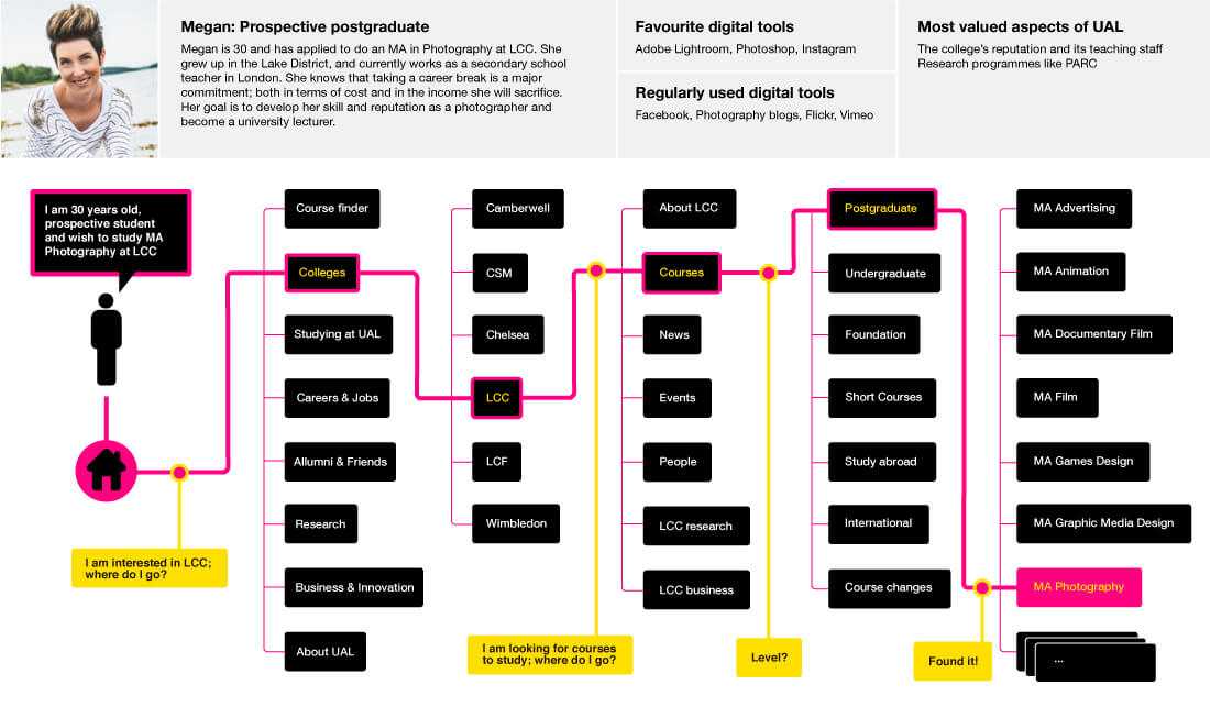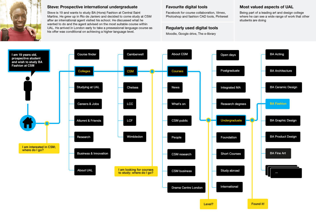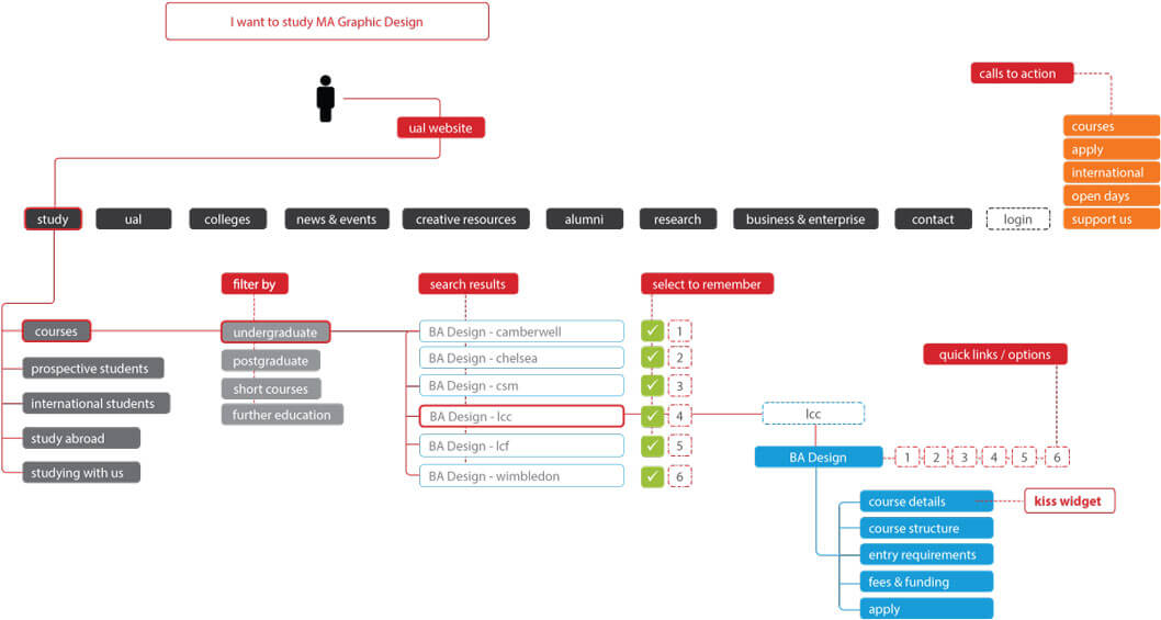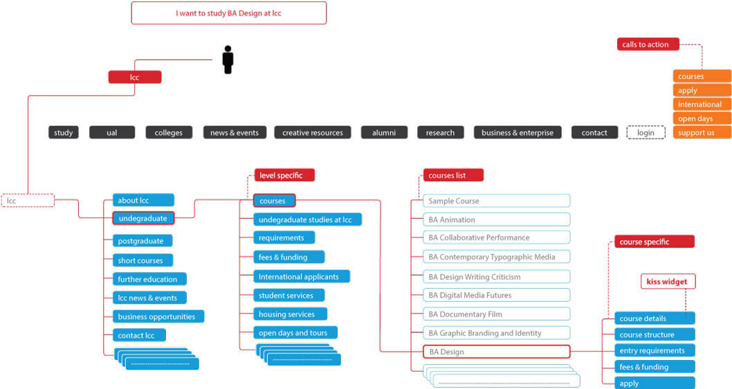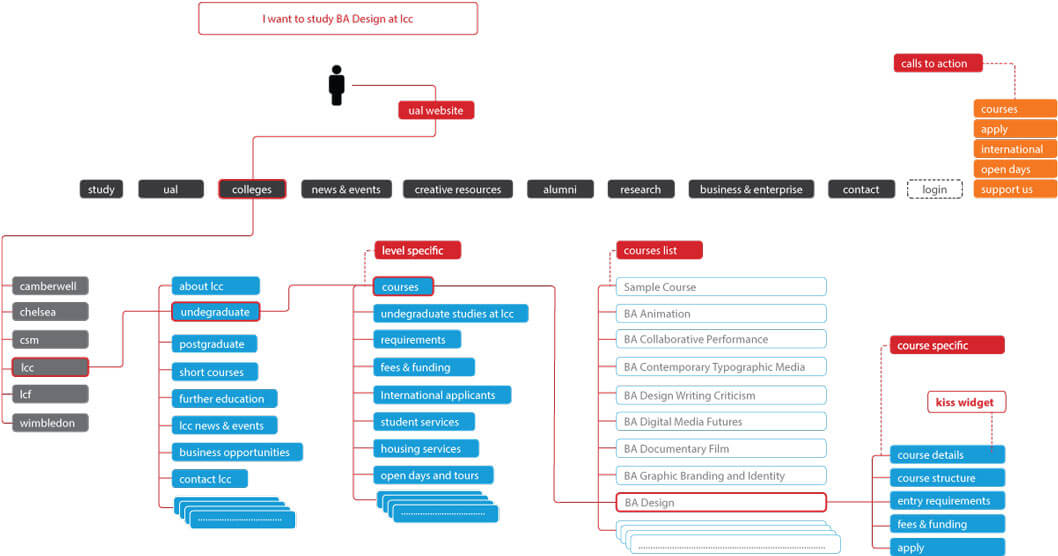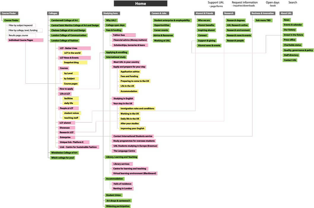 Before the creation of the ual single website, the university digital offering consisted by a main domain occupied by central services and 6 subdomains, one for each college. During the IA drafting process, Webcredible were brought on board to help us test and validate the architecture and select user journeys.