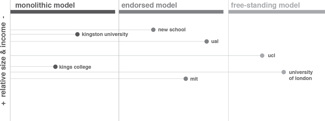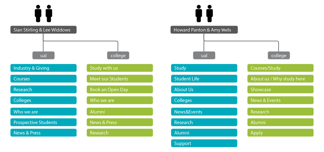 One of the biggest issues we had to explore with a unified site was the relationships of the individual colleges and the university. Brand architecture techniques were employed to help define the college/university boundaries. Three models were offered as options along with all their implications: Monolithic, Endorsed and Free-standing.