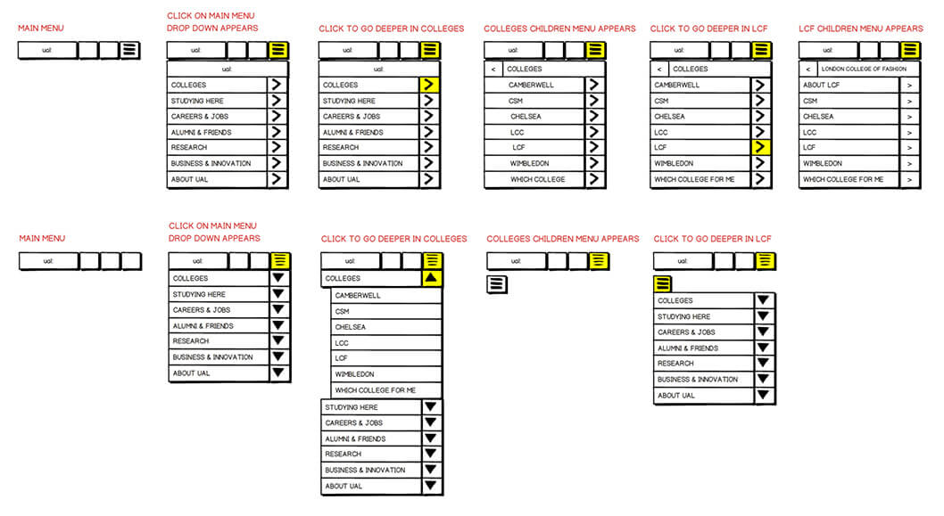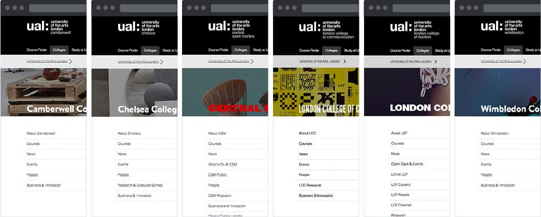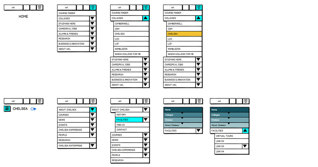 An extra layer of complexity was presented when the colleges asked for direct access to their sections from the global navigation. A business decision was taken to replace the non-hierarchical, user centric links planned to occupy the top right of the global header with direct links to the college landing pages.
