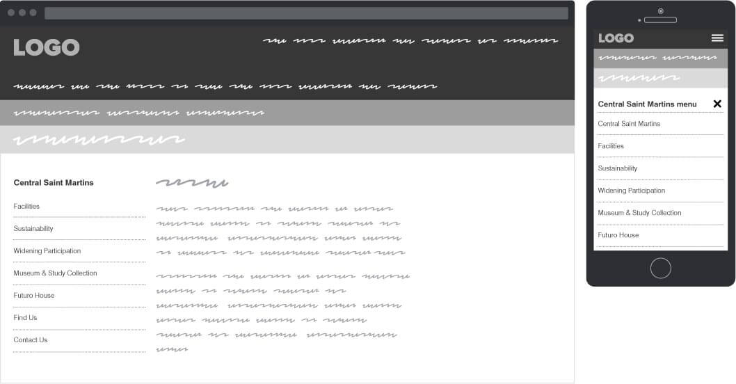 The linear, step by step mobile navigation approach informed the local navigation. Several different approaches such as Siblings+Children & Parents+Siblings+Children were tested but proved to be less effective when it came to sign posting and ease of navigation.